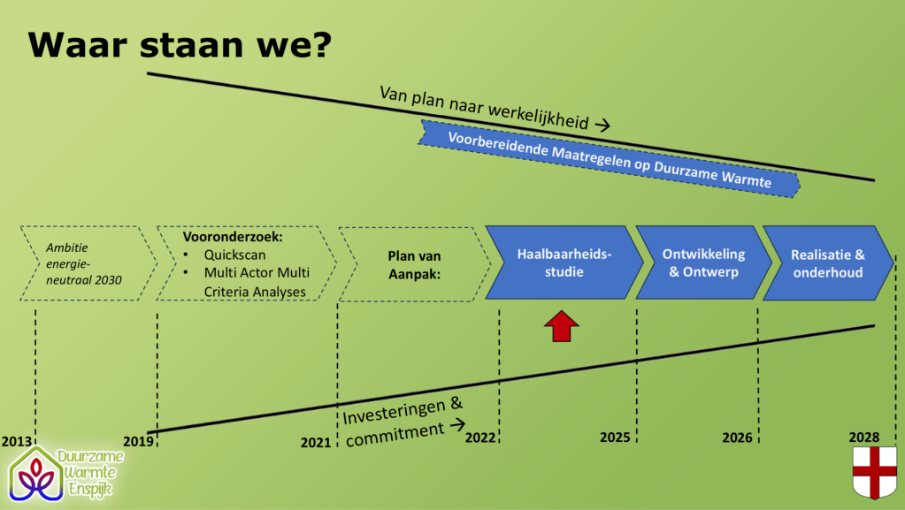 Verleden In december 2020 heeft Royal Haskoning DHV in opdracht van de Provincie Gelderland een quickscan voor Enspijk uitgevoerd om te onderzoeken of een warmtenet met aquathermie als energiebron technisch haalbaar zou zijn. De conclusie was: het is haalbaar. Wel ligt er financieel een forse uitdaging. Van november 2021 t/m maart 2022 werd onderzocht wat het voorkeursscenario voor de energietransitie in Enspijk zou kunnen zijn.