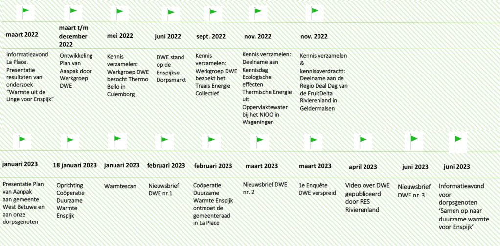 Met deze gegevens is de werkgroep DWE in maart 2022 aan de slag gegaan. Gedurende 2022 heeft de werkgroep DWE het Plan van Aanpak ontwikkeld. Op 18 januari 2023 werd de Coöperatie Duurzame Warmte Enspijk opgericht.