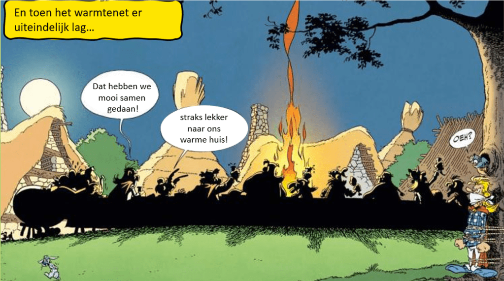 Bij het ontwerpen van de cartoon wilden we een afbeelding maken die zowel grappig als aansprekend was. Het idee ontstond toen vanuit het plaatje van Asterix en Obelix: het dorpje dat standhoudt tegen de Romeinen. Dat beeld voelde als een perfecte metafoor voor Enspijk. Net zoals dat dorpje, staat ons kleine dorp voor een grote uitdaging: een warmtenet realiseren.